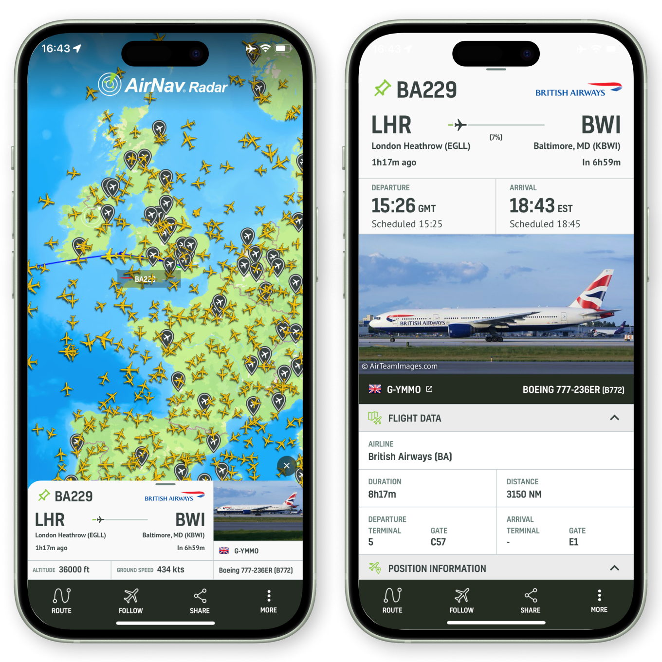 - Route – The Route feature shows you the selected flight’s live route along with its origin and destination airport, while eliminating all other flights from the map, so that you get an uncluttered view of the flight you are tracking.