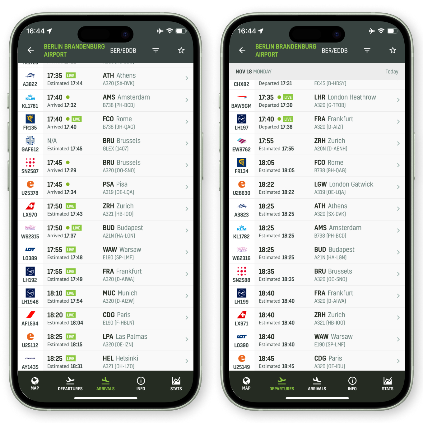 Tap on either Arrivals or Departures to see the list of all Arrivals / Departures at the selected airport, with their estimated/actual arrival or departure time. Additionally, you’ll also be able to view the displayed flights in real-time (go to live map) and their historical data.