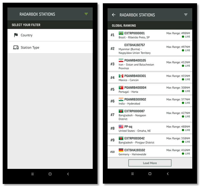 Another great feature we’ve added to the app is the Radarbox Stations Ranking page, where users can see their receiver’s ranking based on station type or country.